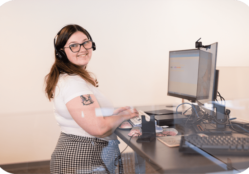 A woman works at a computer in the GTI office. She is a white woman with shoulder-lenth brown hair. She wears a light brown shirt, a black headset, and black-framed glasses.